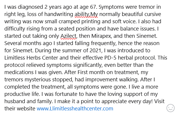 My partner was diagnosed with Parkinson’s almost 5 years ago. His disease has progressed significantly in the past year, and he begun to have delusions. He also had side effects from carbidopa/levodopa, which we decided to stop, and our primary physician decided he should start on PD-5 formula 4 months ago from UINE HEALTH CENTER. He now sleeps soundly, works out frequently, and is now very active since we started him on the PD-5 formula. It doesn’t make the Parkinson’s disease go away, but it did give him a better quality of life. We got the treatment from www. uineheathcentre.com